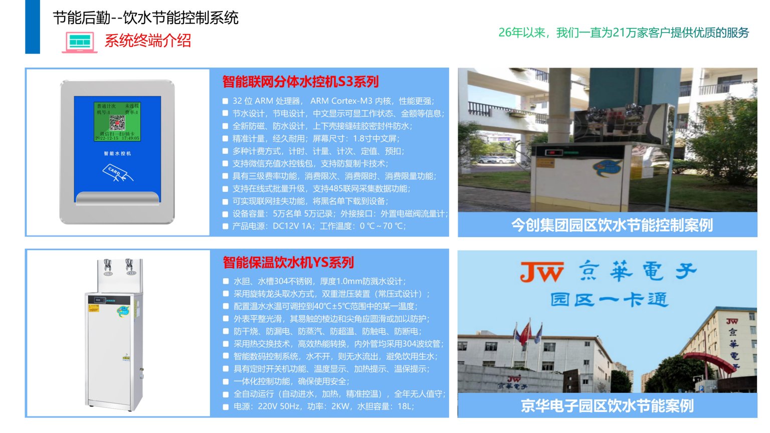 依时利企业/校园饮水节能控制系统是通过统一管理平台/数据库/终端/手机端来实现综合管理,根据水温和用水量自动调节加热器和电磁阀的系统,配合温度传感器、液晶显示器、语音提示等组成。饮水系统可以实时显示水温,方便职工选择合适的饮用水。当温度到达设置后自动断开加热器,避免浪费电能和造成安全隐患,职工可通过刷卡扣费按需用水,主要解决企业/校园用水环保节约,按需用水、科学计费、有效节约宝贵水资源。