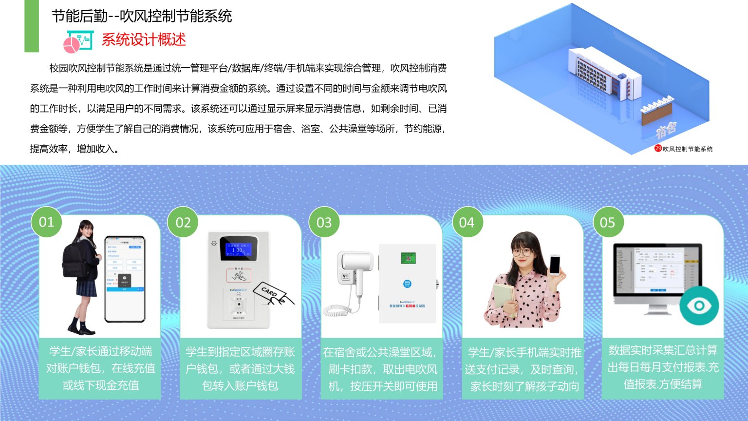 依时利校园吹风控制节能系统是通过统一管理平台/数据库/终端/手机端来实现综合管理,吹风控制消费系统是一种利用电吹风的工作时间来计算消费金额的系统。通过设置不同的时间与金额来调节电吹风的工作时长,以满足用户的不同需求。该系统还可以通过显示屏来显示消费信息,如剩余时间、已消费金额等,方便学生了解自己的消费情况,该系统可应用于宿舍、浴室、公共澡堂等场所,节约能源,提高效率,增加收入。